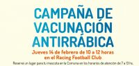 Jueves 14 de Febrero de 10 a 12 horas en el Racing Football Club. Reservá un lugar para tu mascota en la Comuna en los horarios de 7 a 13 horas.