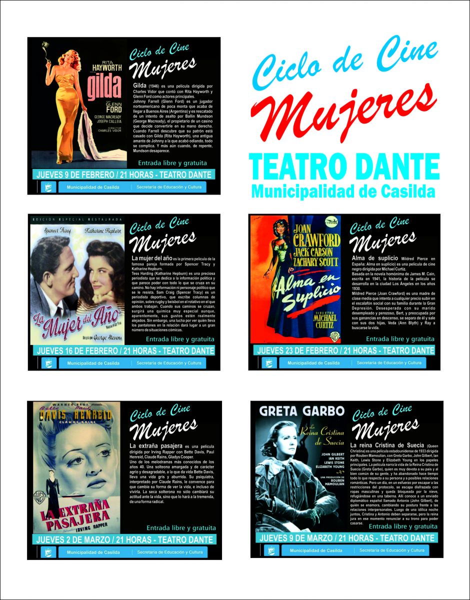 La Secretaría de Educación y Cultura de la Municipalidad de Casilda, a través del Teatro Dante, presenta este ciclo de cine llamado “Mujeres”, en el que cada jueves exhibirá clásicos del cine, comenzando con “Gilda” protagonizada por Rita Hayworth, y Glenn Ford.