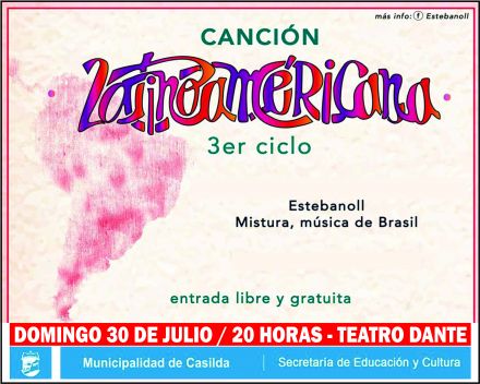 El Ciclo Canción Latinoamericana llega a su fin en esta tercera edición, presentando a su coordinador, Esteban Stoll, y a Mistura música de Brasil. Será el domingo 30 de julio, a las 20 horas, en Teatro Dante, con entrada libre y gratuita.