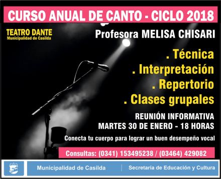 Como cada año, quienes deseen lograr un buen desempeño vocal podrán asistir al Curso de Canto que la Profesora Melisa Chisari brindará en el Teatro Dante. El mismo abarcará técnicas de relajación y respiración para un correcto uso de la voz, trabajos de vocalización estudiando diferentes colocaciones de voz, repertorio y estilo de interpretación; y las clases serán grupales.