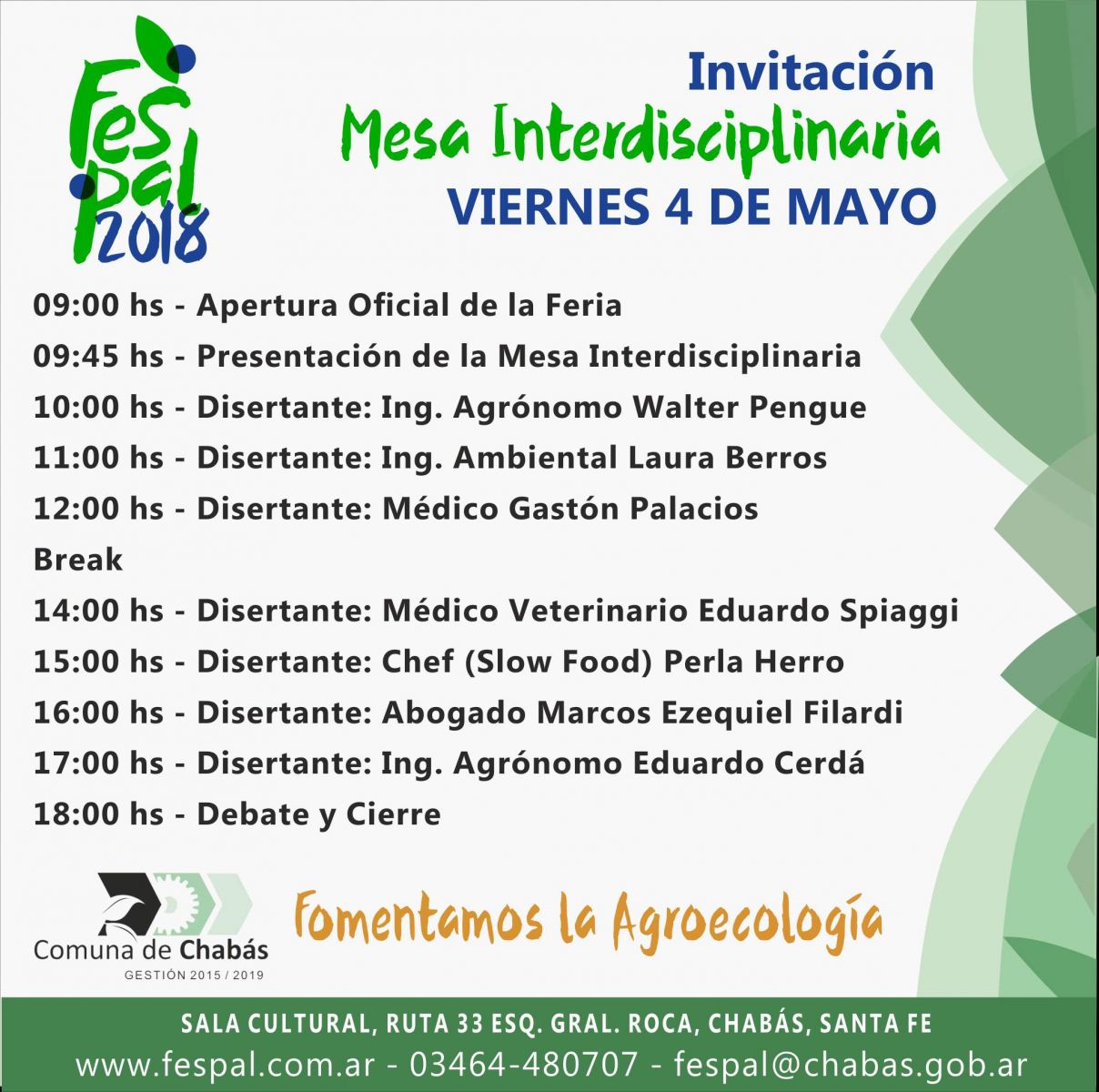 - Viernes 4 de mayo: se realizan los Seminarios tal como estaban planeados, con la Mesa Interdisciplinaria cuyo cronograma adjuntamos, en la Sala de la Cultura de Chabás desde las 9 hs y hasta las 18 hs.