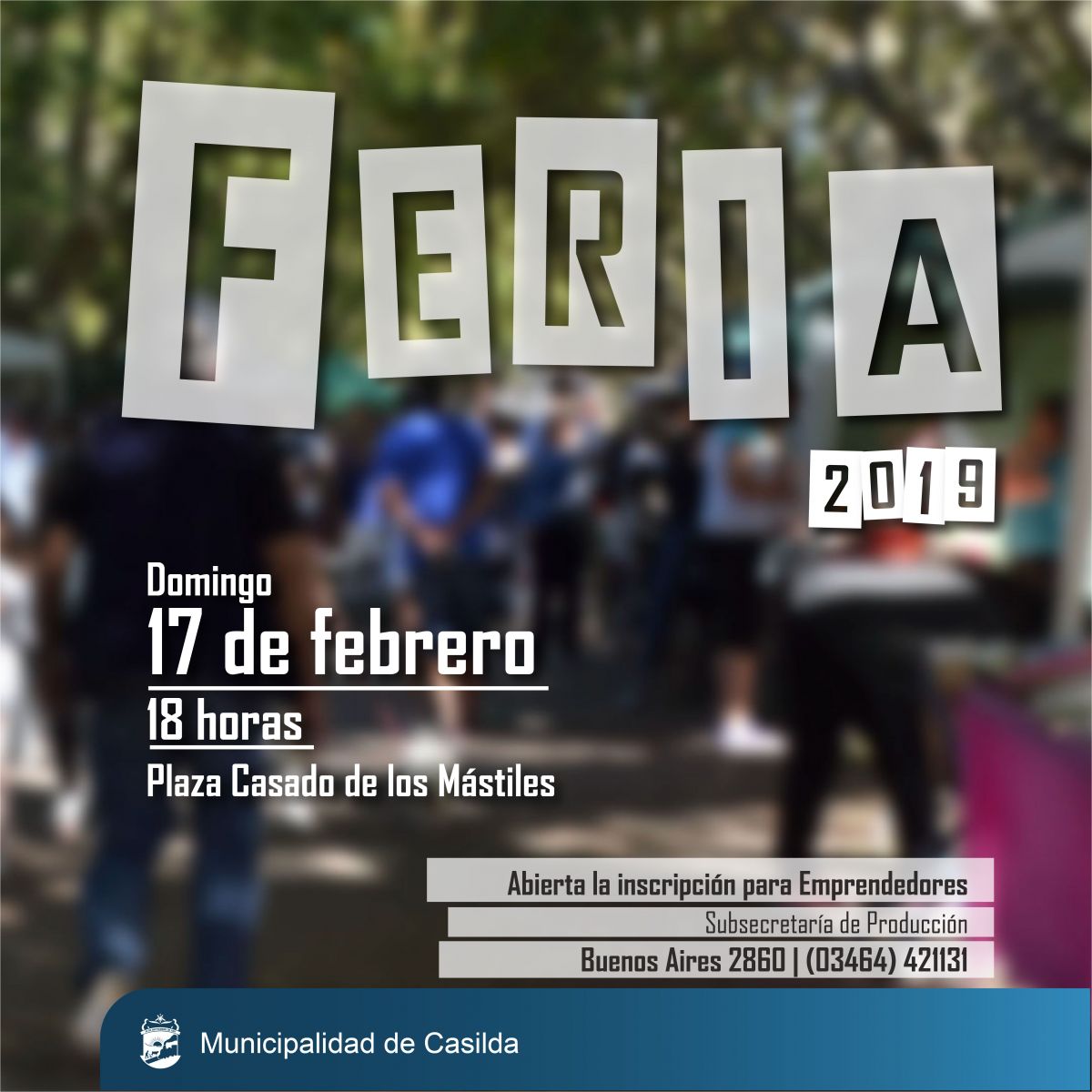 La Subsecretaría de Producción de la Municipalidad de Casilda convoca a emprendedores, artesanos, y manualistas a inscribirse para participar de la Feria de Emprendedores que se realizará el próximo domingo 17 de febrero, a partir de las 18 horas, en el marco del IV Festival Solidario del Grupo Ayudarte en Plaza Casado de los Mástiles.
