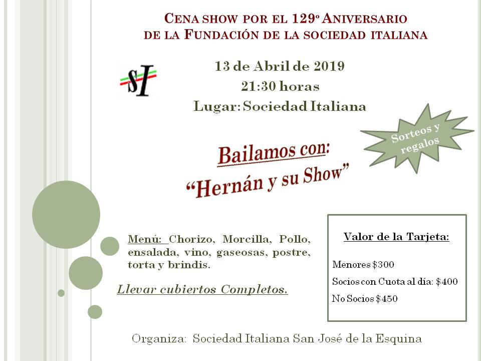 El sábado 13 de abril, a las 21.30hs., la Comisión de la Sociedad Italiana realizará una cena aniversario, en conmemoración por los 129 años de la institución.